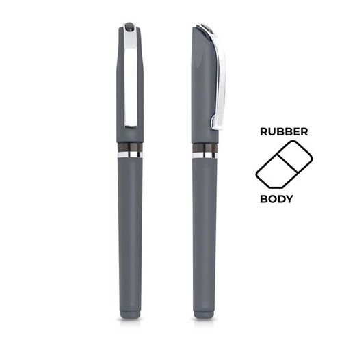 Roller em plástico em plástico, acabamento em borracha. Esferográfica de modelo clássico e sempre seguro para associar à personalização que quiser distribuir. O toque de borracha no plástico atribuí-lhe uma ergonomia distinta, de uso agradável. Com sistema tampa. Esta esferográfica é de escrita preta.
